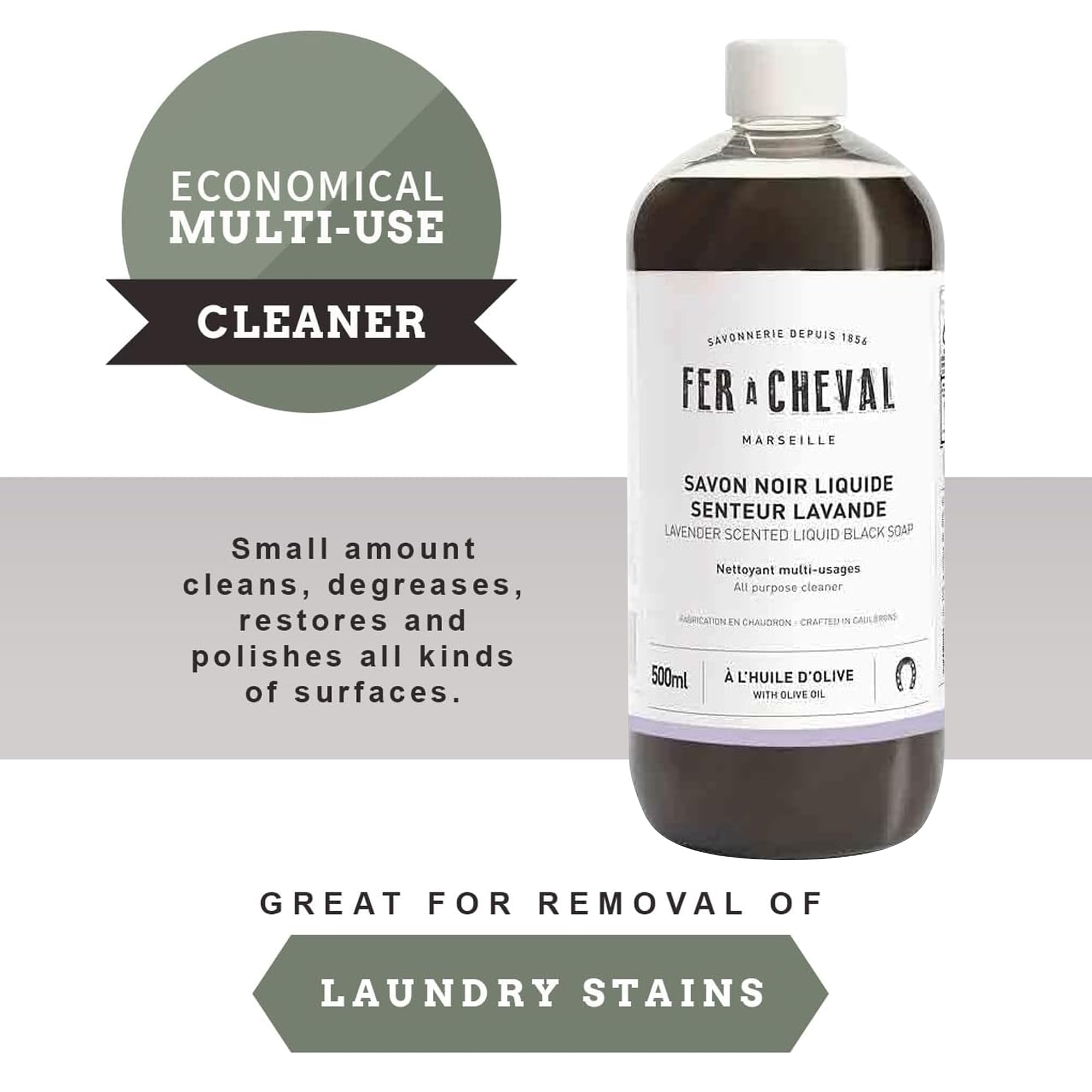 Fer à Cheval Liquid Black Soap Lavender Scent – 10 Pack, 500 ml/16.9 fl oz Bottles | Natural French Multi-Surface Cleaner with Olive Oil | Aromatic All-Purpose Household Soap