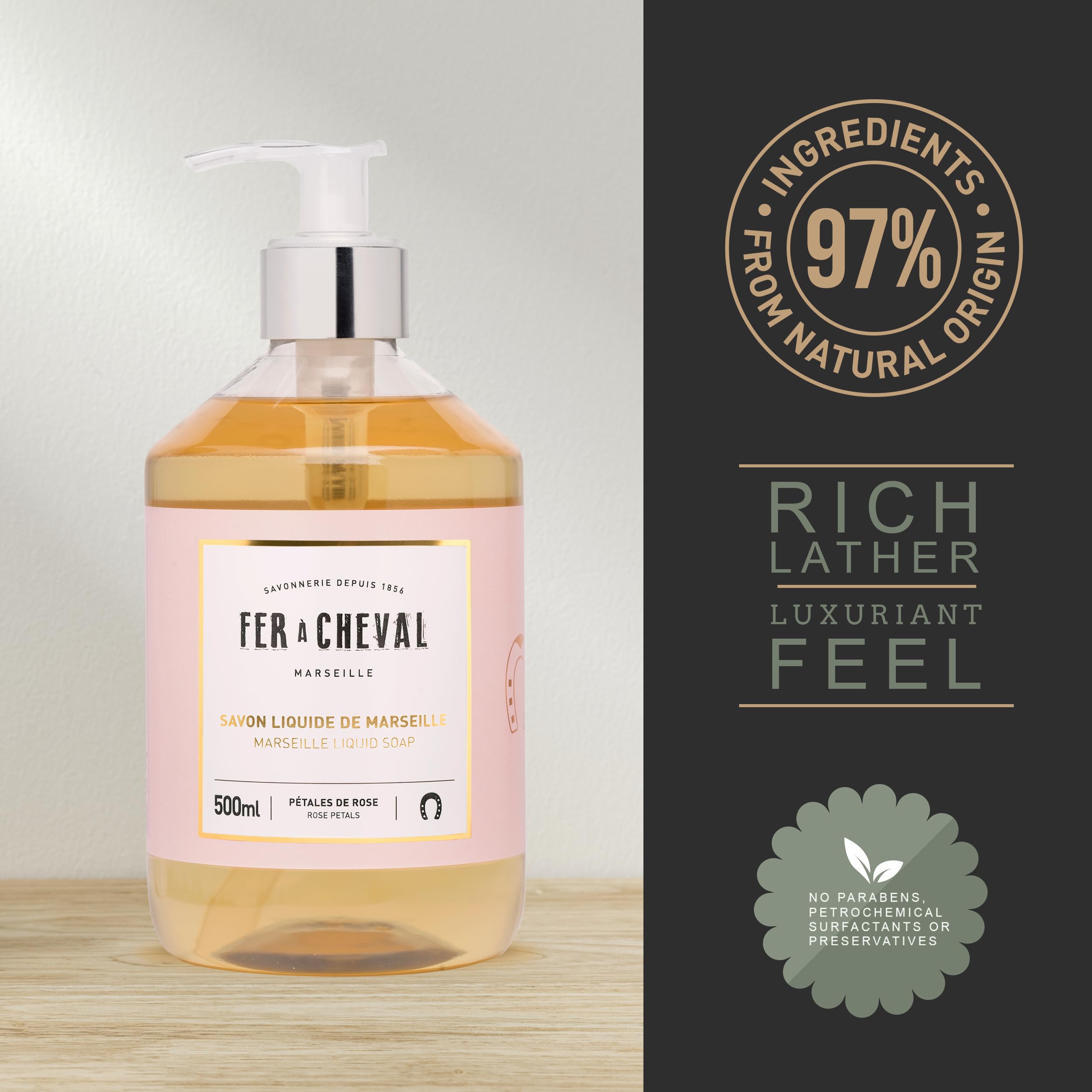 Fer à Cheval Liquid Marseille Soap Set of 6, Rose Petals Scent, 500ml/16.9 fl oz Bottles, French Luxury Liquid Hand Soap, Gentle Everyday Cleansing—