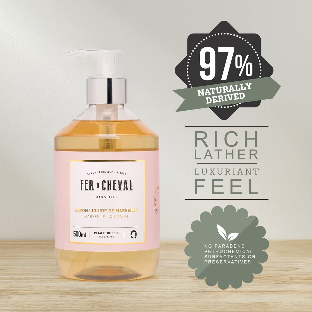 Fer à Cheval Marseille Liquid Soap, Luxury Rose Scented Liquid Marseille Soap, Rose Petals, 500 ml/16.9 fl oz